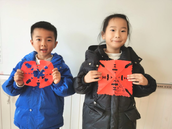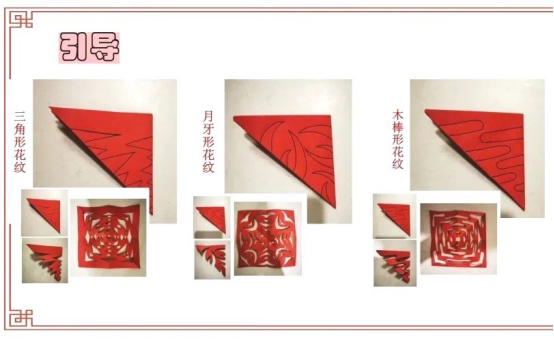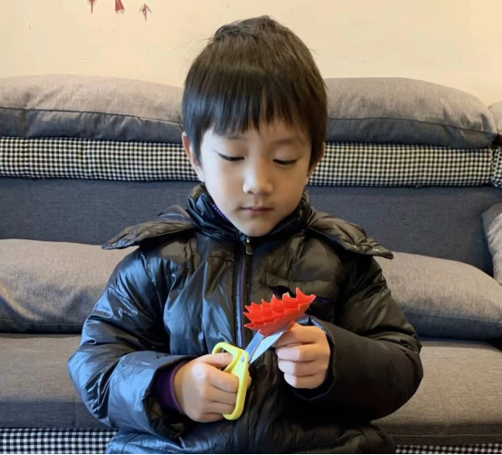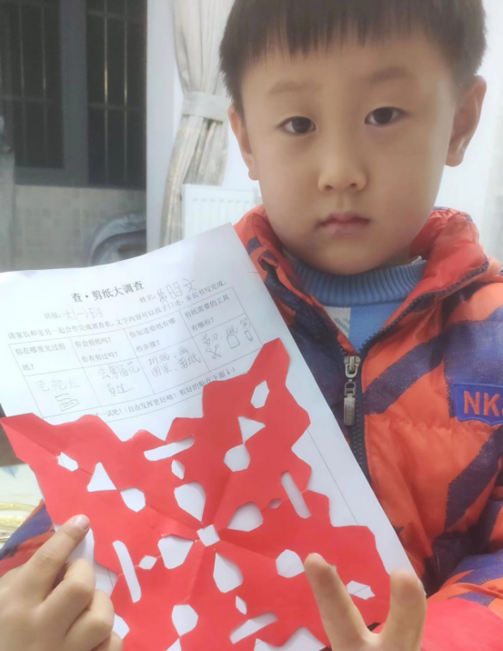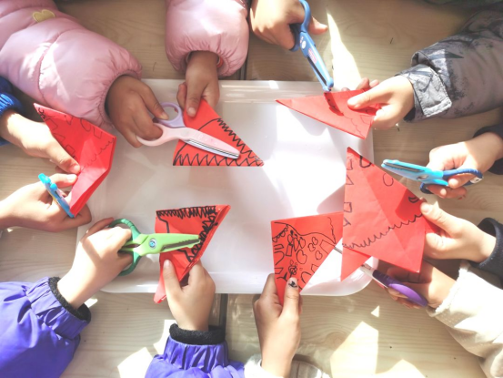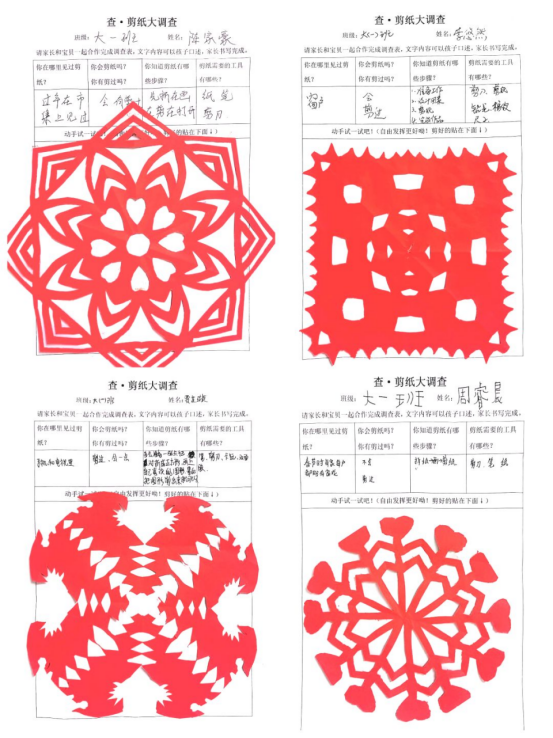 经过多次的失败,孩子们发现折出来的纸张主要分为中心点和边缘线两部分,当沿着“中心点”两边剪出来的花纹是非常美丽且不易断裂的。但是新的问题也接踵而来。