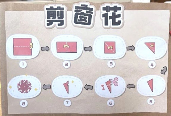 为了满足孩子们的需求,我们提供了剪纸步骤示意图,引导幼儿观察与尝试。