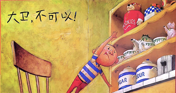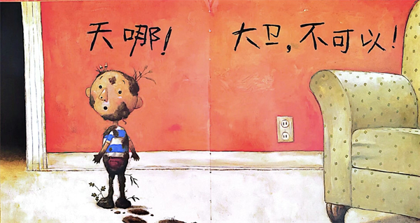 这个天真无邪、把家里搞得一团糟的小男孩,让大家觉得又开心又释怀,世界上哪一个幼儿不渴望像大卫一样随心所欲地在墙壁上乱写乱画、把浴室变成一个沼泽地、头戴铁锅敲得叮当乱响,最后大卫被妈妈紧紧地搂在怀里,幸福地闭上了眼睛,妈妈一句“大卫乖,我爱你”。