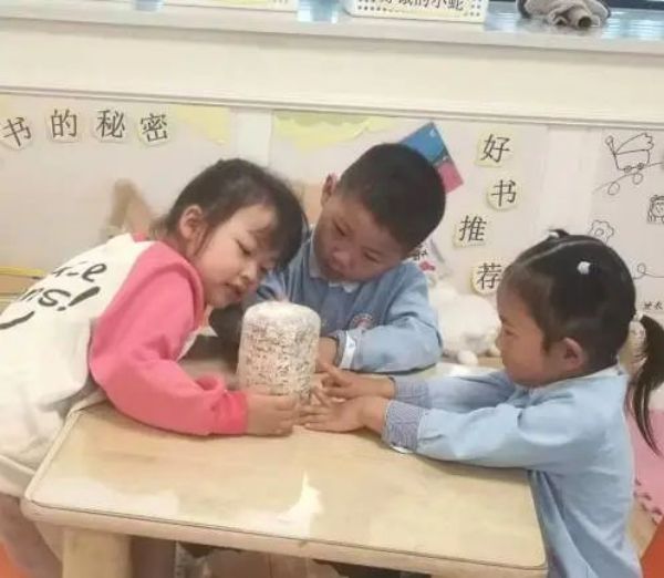 教师带着孩子们在丰富多彩的绘本世界中,追寻蘑菇生长的秘密。他们一页页翻阅,在精美的图画中寻找线索,探索蘑菇生长所需的条件。