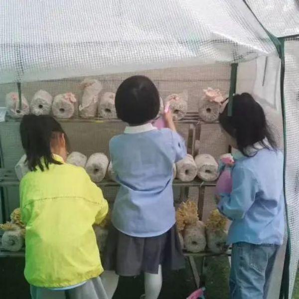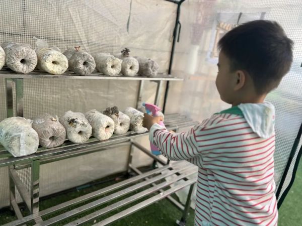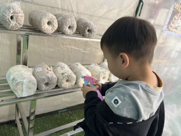 教师的思考:每一次的浇水都是对蘑菇生命成长的呵护与关怀,同时也为孩子们提供了一个观察蘑菇生长变化的宝贵机会。通过这样的实践活动,孩子们不仅能增强责任感,还能在细致的观察中感受到生命的奇妙与美好。