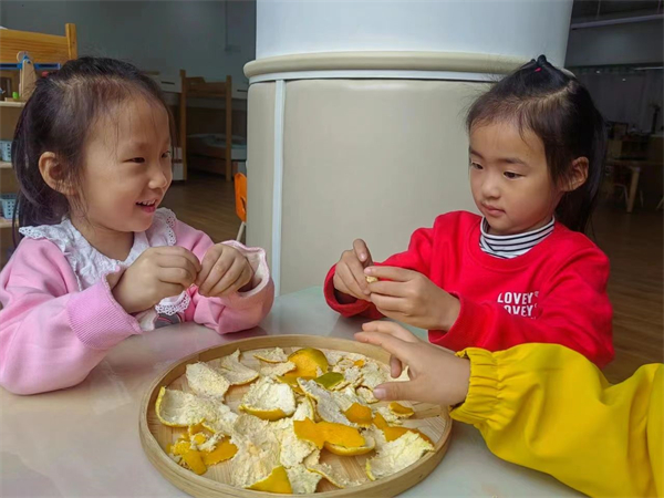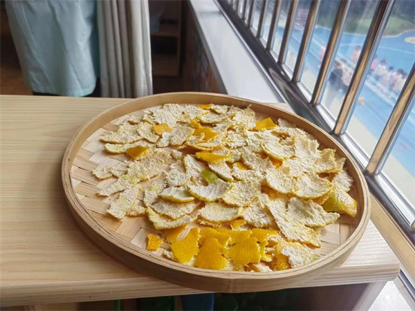 吃剩下来的果皮可不能浪费了,孩子们将橘子皮收集起来,装进篮子里,趁着天晴,他们把篮子放在太阳下,晒起了橘皮……