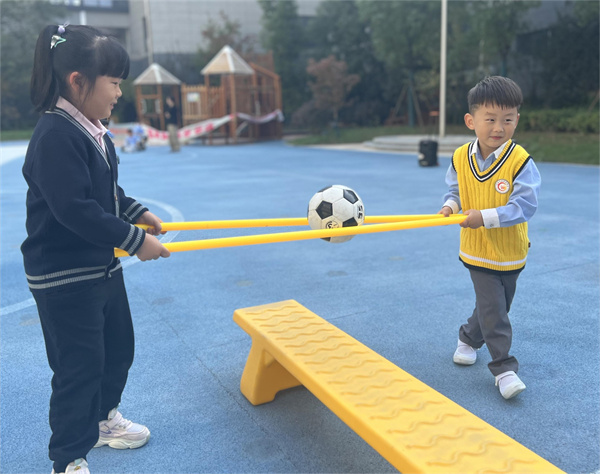 孩子们用筷子运球,体验的与同伴合作的意识。