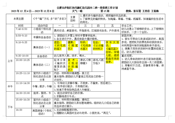 小朋友们积极参与讨论,自由表达自己的想法,在讨论过程中我们发现小朋友对编织了解的并不多,为了让小朋友更多的了解编织,我们将编织融入班本课程一日生活之中,让小朋友直接感知、实际操作获得对编织更多的认知。