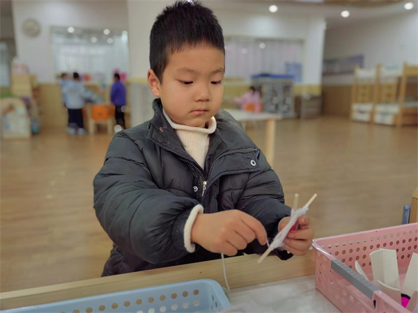 认识编织材料后,大家进行生活活动,这时沐安说:“我们认识了这么多的线,没有工具我们也编不出来啊。”