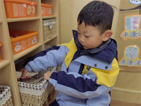 下午小朋友吃完点心,开始到功能室活动——木工坊,小朋友们开心地来到木工坊借助机器把木板切割成小鱼的形状,一部分小朋友被编织区的毛线所吸引,看到墙上挂的毛线和编织的成品忍不住去摸。