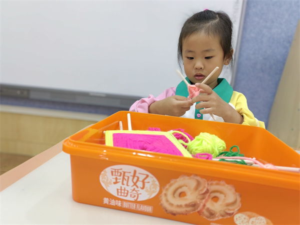 经过小朋友们一次又一次的操作尝试中,遇到的问题都进行了有效的解决,学会了编织绕线的初步方法,对编织的兴趣更加强烈!操作过程中小朋友的思维越来越活跃,小手越来越灵活,动作也越来越协调。