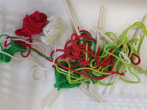 在曼达拉编织的基础上小朋友们有了经验,现在将原有的两根木棍增添至了三根木棍或者四根,将木棍头拼接在一起形成了三角骨架后,再进行编织。小朋友们认真、有条理的编织手中的物品,编织的颜色也从单一的毛线,换成多种毛线,编织出了一条条独特的小鱼。