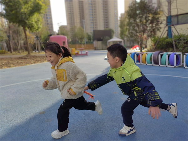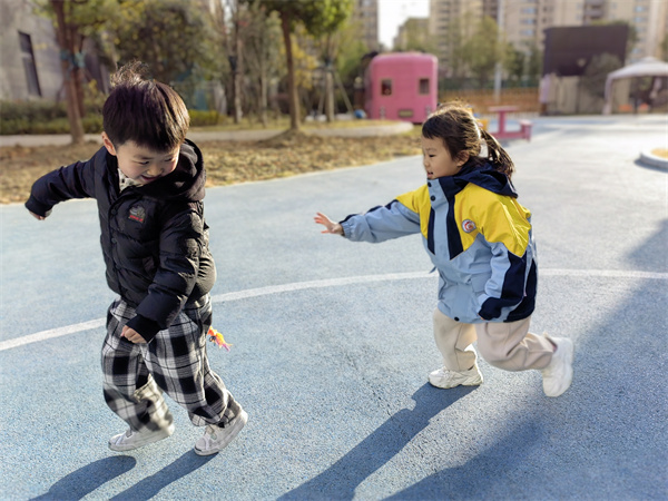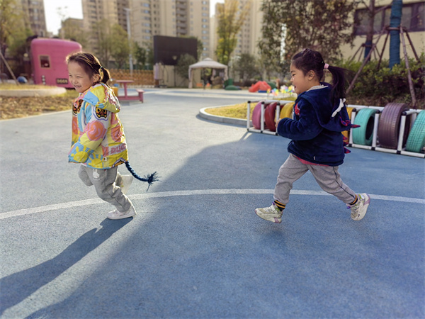 瞧,小朋友将自己编的麻花辫投入户外活动,玩起了抓尾巴的游戏。