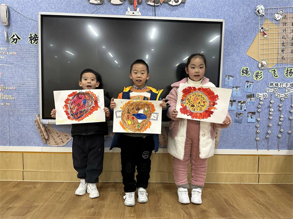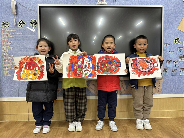 瞧!摆在面前的是冒着热气腾腾的火锅,里面的红汤烧的滚烫,还冒着泡泡,里面煮着非常美味的菜肴,有鸡腿、蘑菇、小白菜、培根……看起来真是美味极了!一起来看一看孩子们创作的“火锅”吧!