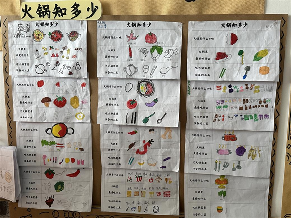 在课程探索的过程中,通过亲子问卷大调查,了解到幼儿知道火锅的部分口味、食材、工具,对火锅的来源、制作、对火锅店的经营十分感兴趣。