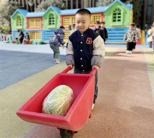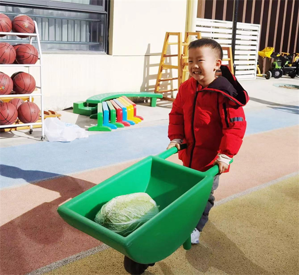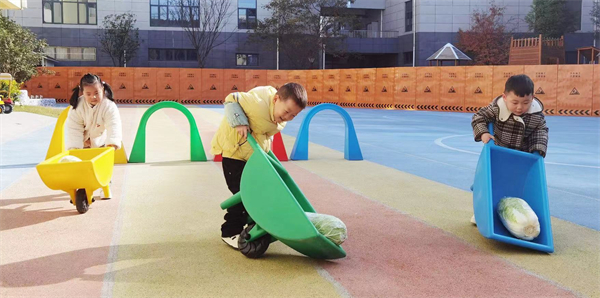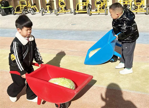 瞧!比赛开始了,孩子们推着车,兴奋地往前冲,虽然大白菜会时不时掉出来,推车会失去平衡,但他们仍不气馁,在同伴的呐喊声中完成了比赛。