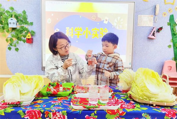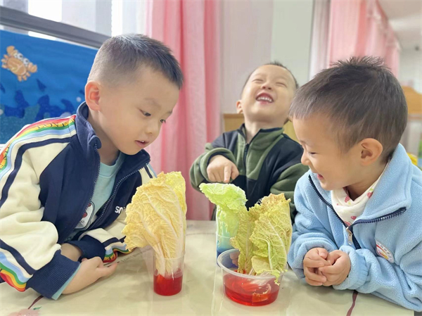 如何让孩子们喜欢上白菜,“接纳”这位新朋友呢?随着一棵白白、嫩嫩的大白菜的到来,小班组开展了一场关于白菜的趣“遇”之旅。