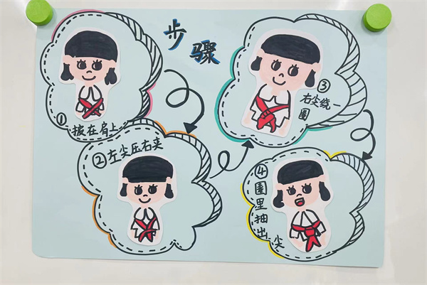 认识了红领巾之后,宝贝们学习了系红领巾的步骤及方法。