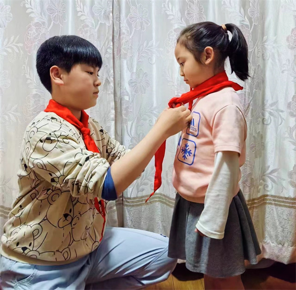 为了帮助小朋友对红领巾有了更深的了解,家里的哥哥姐姐帮助自己的弟弟妹妹佩戴红领巾,并告诉他们少先队员应该爱护红领巾!