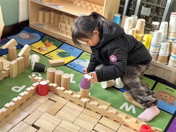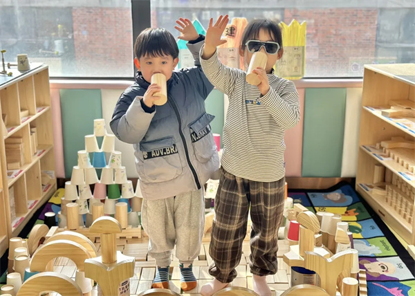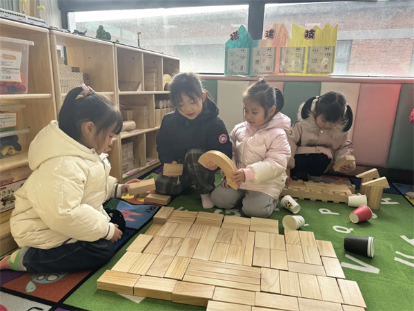 晨晨:沐希,我们再搭个舞台的背景吧,用方型的积木来搭吧。