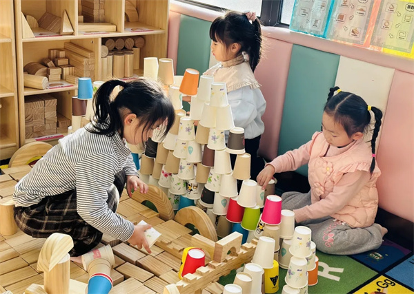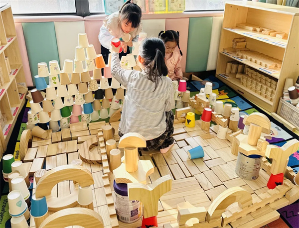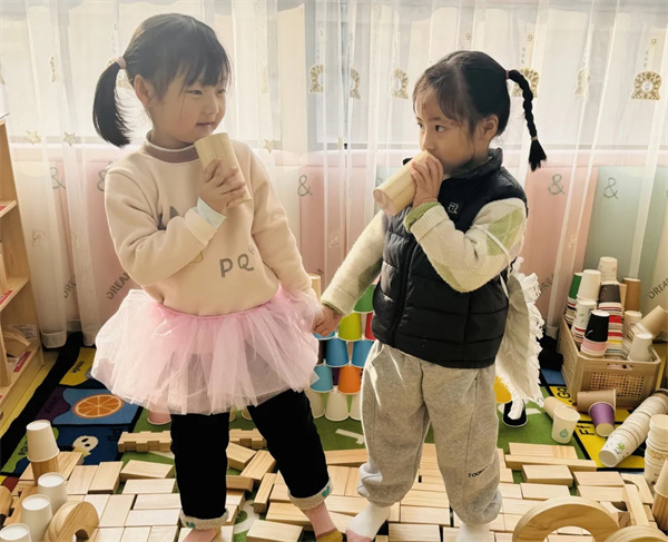 沐希提出用纸杯来搭建舞台背景,启发了小伙伴们使用多种材料进行搭建。在大家共同商量、交流中将作品设计得更加完美,向我们证明了儿童的学习和发展路径是多元的。《指南》中社会领域人际交往目标2中提出:“对大家都喜欢的东西能轮流、分享。”“活动时愿意接受同伴的意见和建议。”幼儿在游戏中不争不抢,能与同伴分享,且在搭建时能虚心接受同伴的意见。