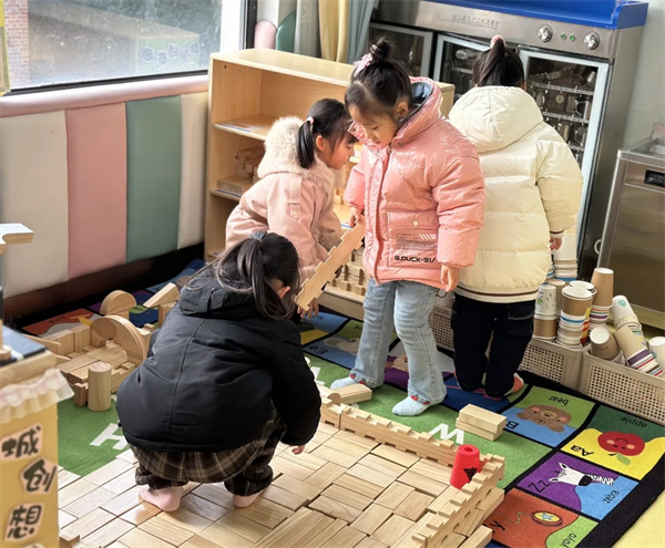 今天沐希等几个小女孩一起在建构区搭建积木,沐希把一块块长方形积木平铺开,引起了琪琪的注意。
