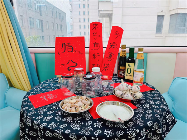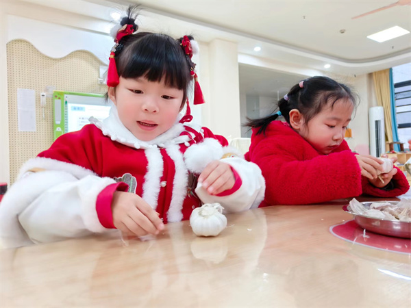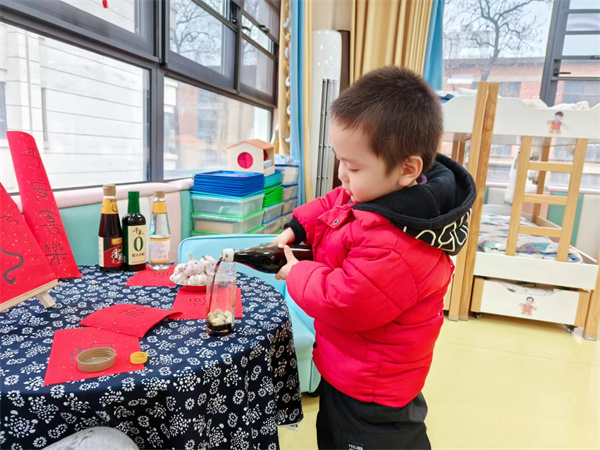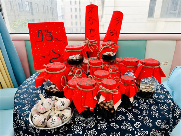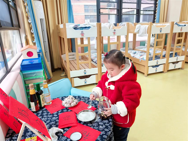 我国北方的大部分家庭还会在腊月初八这天有用醋泡蒜的习俗,叫腊八蒜。腊八蒜就是用醋来泡制大蒜瓣,其材料就是醋、大蒜瓣儿和白糖。腊八醋,要泡到大年初一,初一吃饺子,要吃素饺子,取一年素素净净之意,蘸腊八醋吃,别有一番滋味是。“腊八醋”不仅味道醇正,而且久放不坏。于是,小三班的小朋友们和老师一起腌制了一罐罐美味的腊八蒜!