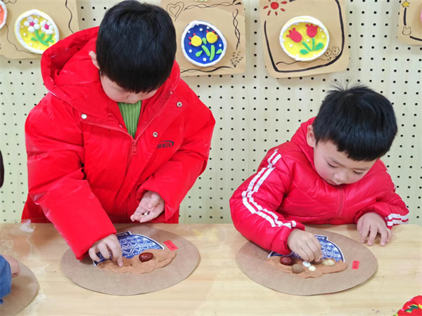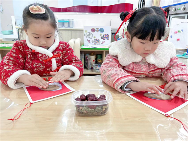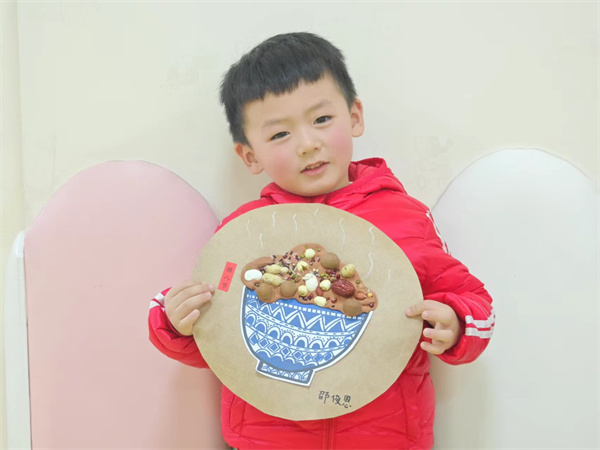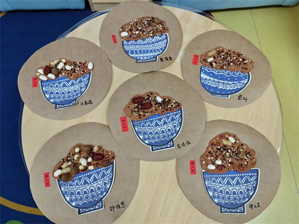 同时小朋友们也和老师动手动脑,利用各种豆子、卡纸和橡皮泥等材料制作了关于腊八粥的精美手工作品。