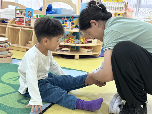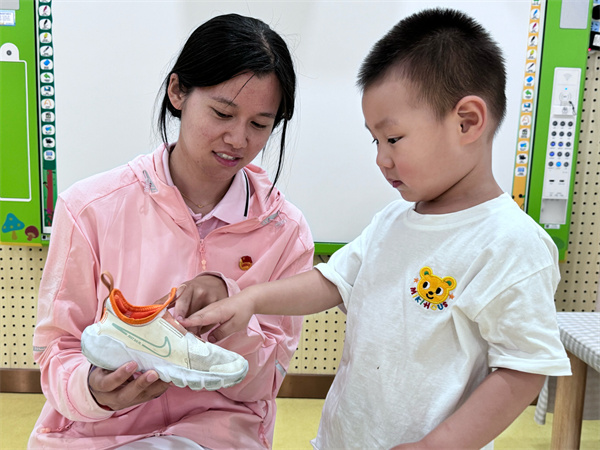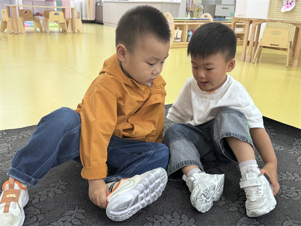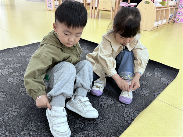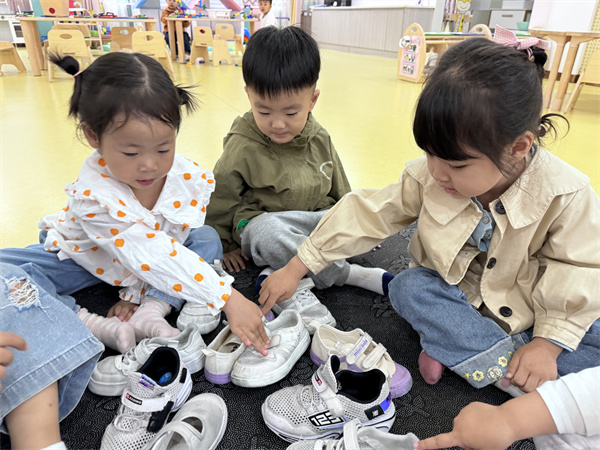 在日常生活中,总有几个幼儿是懵懵的状态,认不清自己的鞋子,拿着别人的鞋子往自己脚上穿。于是,我们从幼儿的实际问题出发,针对个别幼儿不认识鞋子的情况进行了一对一指导。首先带领幼儿认识自己鞋子的花纹和颜色,通过用手摸,眼睛看熟悉自己的鞋子,随后开展找鞋子游戏,加深幼儿对自己鞋子的印象。