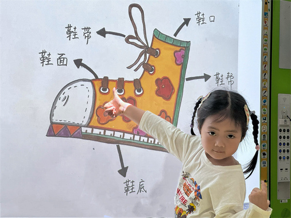 老师通过阅读绘本和儿歌让宝贝们知道鞋子的构造,带领幼儿认识鞋子“身体”上的各个部位,认识生活中各种各样的鞋以及它们的用途。