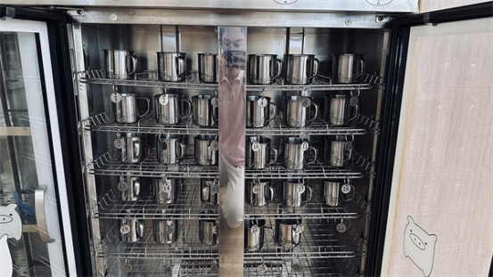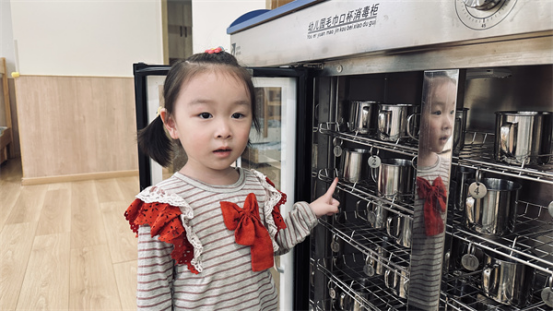 水杯柜是班级所有幼儿水杯的家,每位幼儿都有专属于自己的小水杯,幼儿的水杯架上有独属于自己的数字牌,可以寻找到属于自己的水杯。