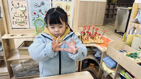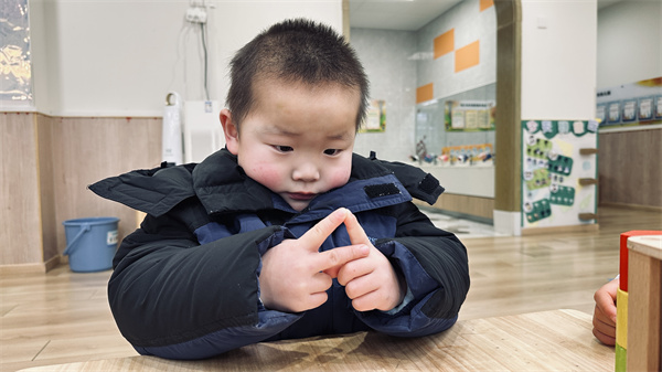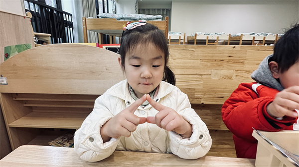 灿灿:我可以用两个食指和大拇指变成三角形。