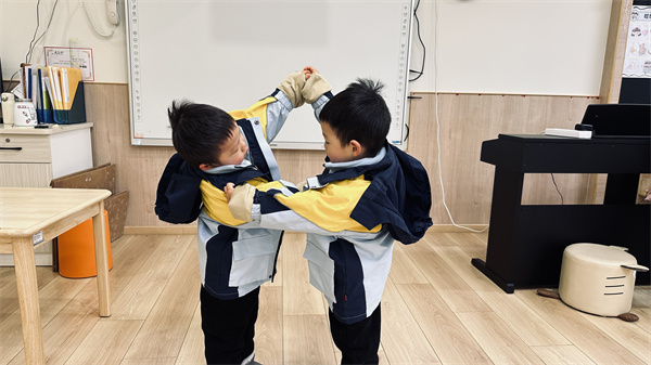 通过寻找三角形后,幼儿进一步对三角形有了深刻的认识。灿灿用小手搭在一起说:“老师,你看尖尖的小角。”欣欣说:“可以变成三角形。”用身体搭三角形就生成了。