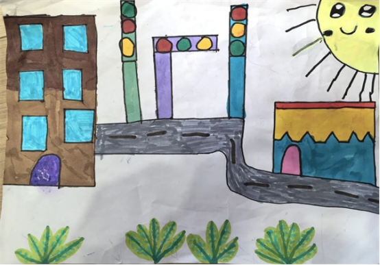 幼儿园就在我家小区门口,我走路上学一会就到了。但是我们要路过好几个路口。