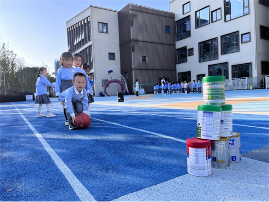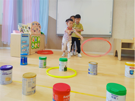可别小瞧这些瓶子罐子,它们的玩法还很多,孩子们自发玩起了瓶罐投壶、瓶罐独木桥、瓶罐套圈圈、瓶罐保龄球等游戏,在探索与瓶罐有关的游戏中收获了快乐,还了解到了合作的重要性,提高了游戏水平。