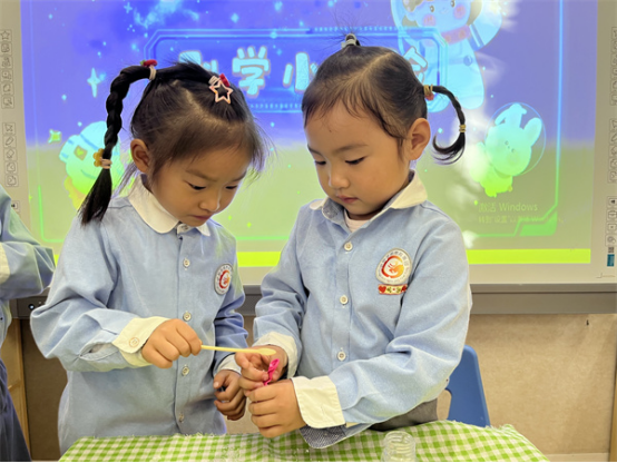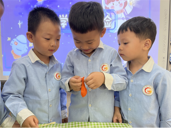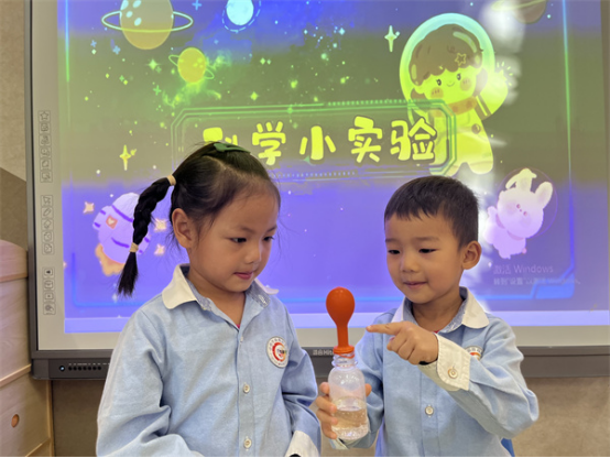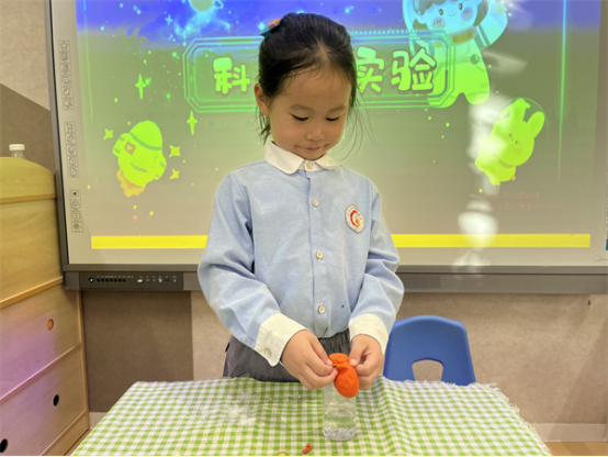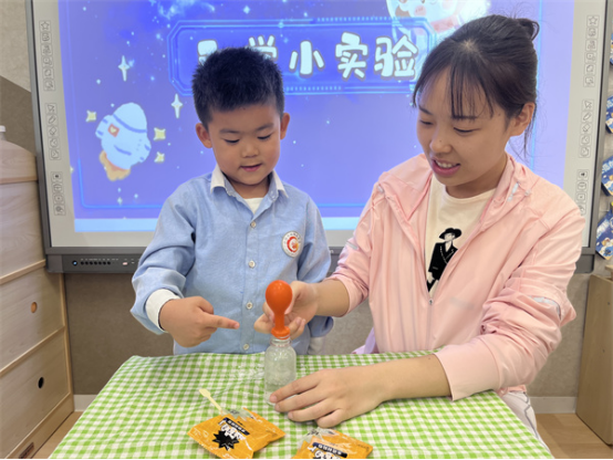 原来,当小苏打和白醋混合在一起时,会进行快速反应并生成二氧化碳,由于不断进行反应,使得二氧化碳气体越来越多,逐渐被挤到气球中,气球逐渐被吹大。孩子们在观看实验的过程中感受科学的神奇与魅力。