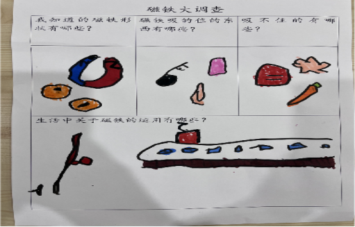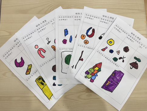 生活中有哪些东西是可以被吸住,哪些是不可以被吸住的呢?为了更好地总结经验,我们制作了一份《磁铁大调查》,让孩子和家长一起用图文结合的形式将结果记录下来。