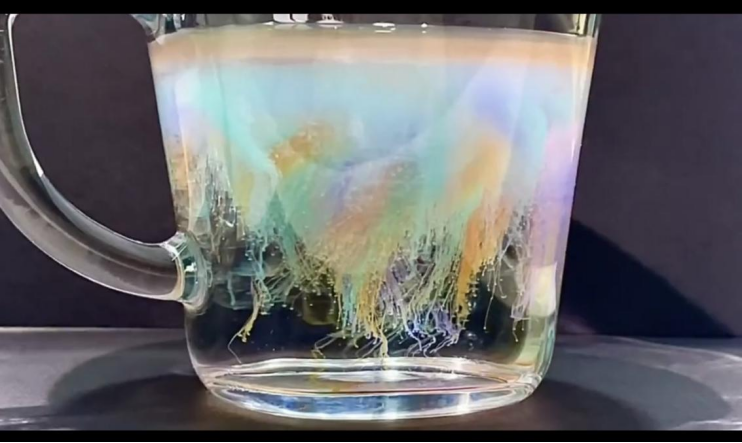 4.染色的牛奶用滴灌滴入带有盐水的透明杯中。