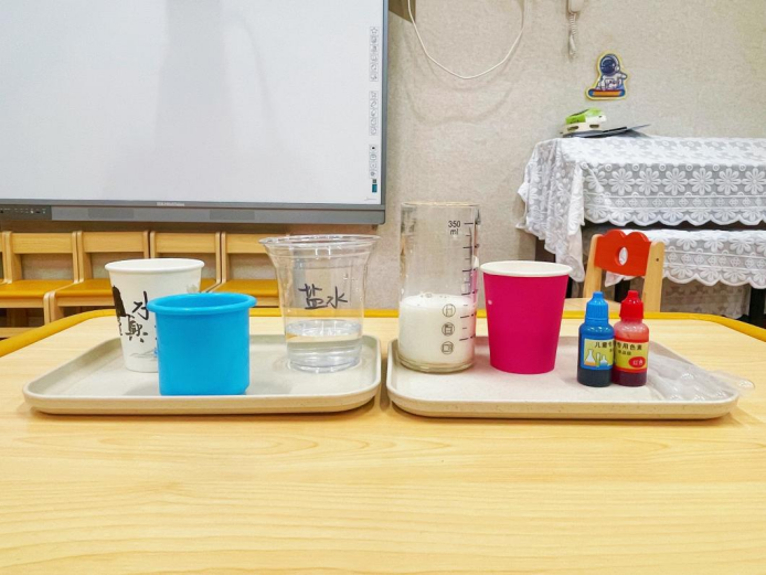 清水、盐水、色素、牛奶、滴管、透 明杯子