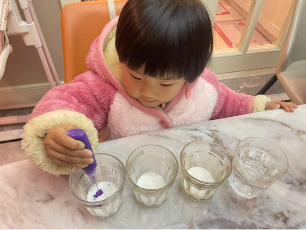 3.牛奶中加入自己喜欢的色素搅拌均匀。