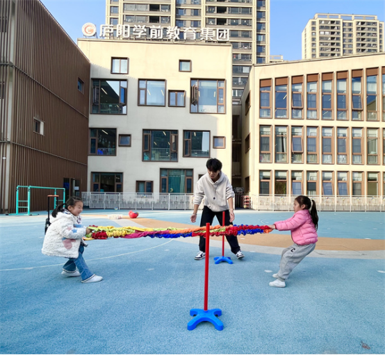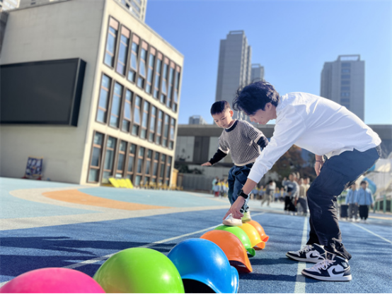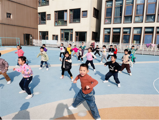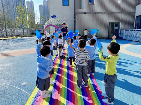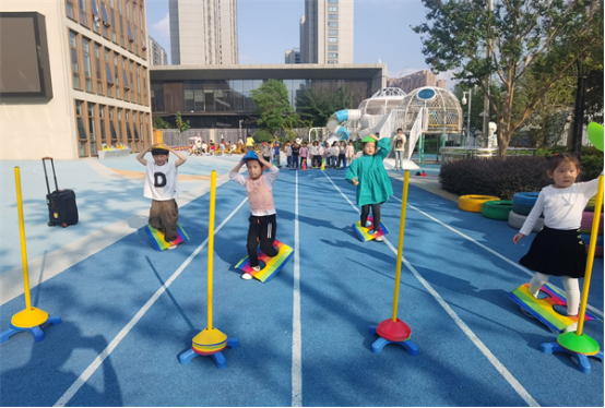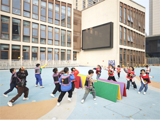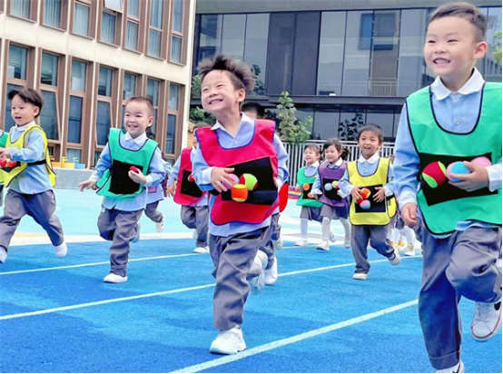 大班的幼儿身体素质较强,体力充沛,动作更加协调有力、灵活自如。所以在课程内容的设置上,除了追求速度、力量和协调性的同时,团队合作、个人及集体比赛的游戏形式占比较高,游戏中更进一步强化幼儿的规则意识。同时课程中还需注重融合式教育,通过融合多领域的教育目标,建立幼小衔接意识,如:《企鹅快跑》《星球大战》《拔河》等。