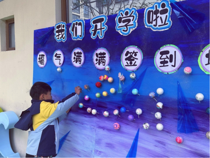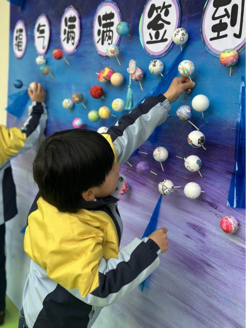 以开学之名,载祝福之意。清晨,孩子们正欢呼雀跃地步入久违的幼儿园,在一个个大大的拥抱、一声声热情的“早上好”中拉开了新学期的帷幕。绚烂的星球,每颗星球都蕴藏了一个甜美的梦,瞧!孩子们将自制的DIY“星球棒棒糖”插在“宇宙”签到板上,同宇宙星空来一次亲密接触,点亮属于自己的星球。满满的希望、满满的祝福,寓意着新学期、新启航,新的一年更加棒棒棒!