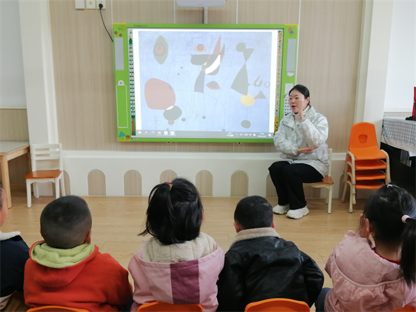 在散步活动中,幼儿发现每天进进出出的大厅环境发生了变化,并对我们米罗班的米罗大师产生了兴趣。我决定抓住此次教育契机,创造条件支持幼儿自主自发的学习。从幼儿的兴趣点切入,聚焦米罗,欣赏优秀的艺术作品来提高幼儿的审美,和幼儿一起探秘米罗。