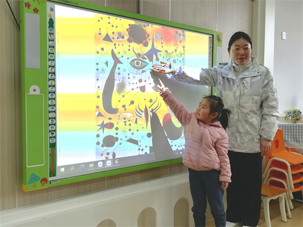 通过谈话和作品欣赏,幼儿了解了米罗的绘画特点:简单的线条、象征性米字符号和基本色:蓝、红、黄、绿、黑、白。图形、线条、色彩的大胆组合,点线面元素的碰撞,成就了米罗的独特艺术风格。