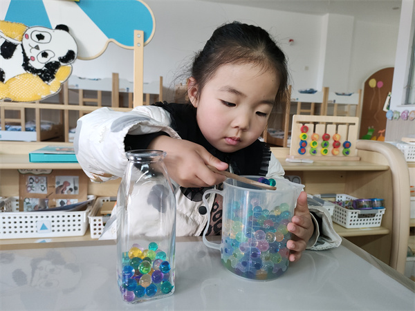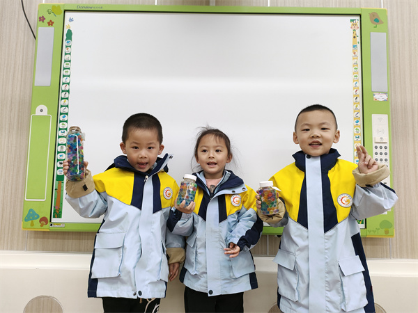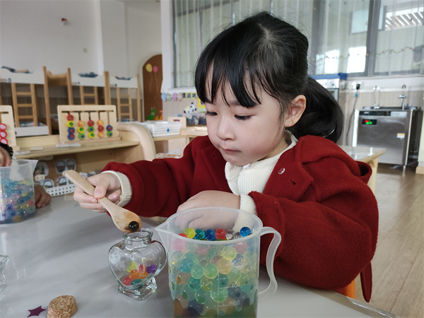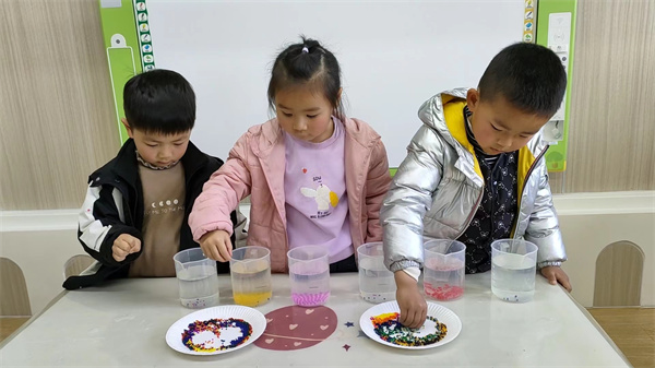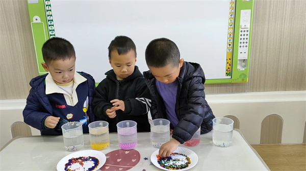 每个幼儿心里都有一颗美的种子,幼儿在区域游戏时看到五颜六色的海洋宝宝就联想到米罗的色彩,通过操作、探索发现海洋宝宝具有吸水性,膨胀的海洋宝宝还可以用来装饰班级植物角。幼儿在游戏中发现,在发现中创造。