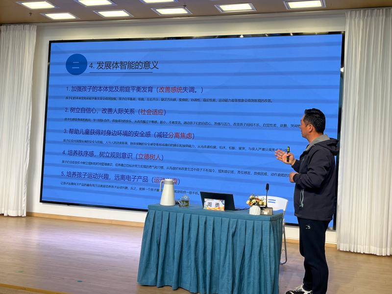 为积极贯彻《3—6岁儿童学习与发展指南》,进一步丰富幼儿户外体育活动的形式和内容,增强幼儿户外游戏中的体能发展。2024年3月22日上午,合肥市清源融和幼儿园邀请了合肥市第四十二中的周勇老师到园进行《如何发展幼儿体智能》的培训。
