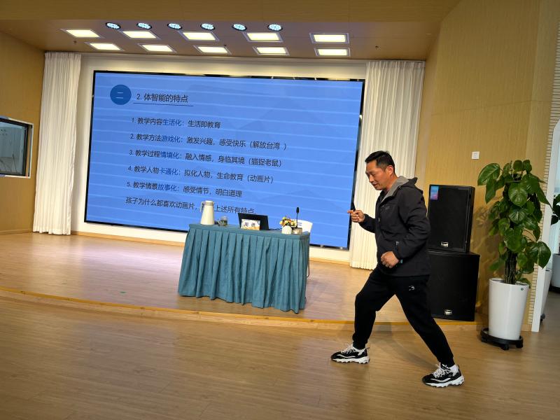 在培训过中,周老师通过PPT、举例分析等方式,详细介绍了体智能的含义、体智能的特点,以及如何发展幼儿体智能等展开详细的讲解,提高教师对体智能的认识,让教师们站在幼儿视角,更加深入了解体智能。