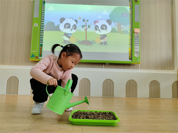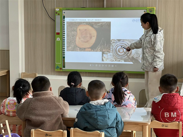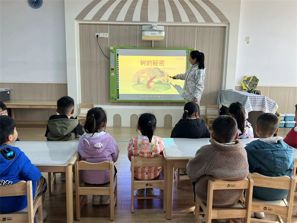老师通过视频、图片、故事等方式让孩子们知道植树节的由来、植树节节徽,以及让孩子们了解树的结构。