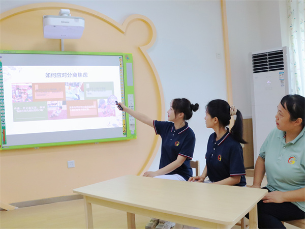 小班组老师们以“用爱呵护,分离不焦虑”为主题,结合实际案例以及绘本故事,帮助家长辨别入园焦虑、正视入园焦虑,科学指导家长如何帮助孩子从心理、能力、作息、物质等方面做好入园准备。