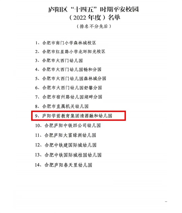 一直以来,我园认真贯彻落实上级有关规定,以确保幼儿园保教工作顺利进行为出发点,提高师幼和家长的安全意识及广泛开展安全教育活动为途径,积极推进平安校园创建,不断建立健全科学规范的管理模式和长效管理机制,全面构建校园安全责任体系,安全工作取得了良好成效,荣获2022年度“平安校园”称号。此项荣誉,既是各级领导对我园“平安校园”建设工作的充分肯定,更是对我们进一步做好校园安全工作的最大激励。