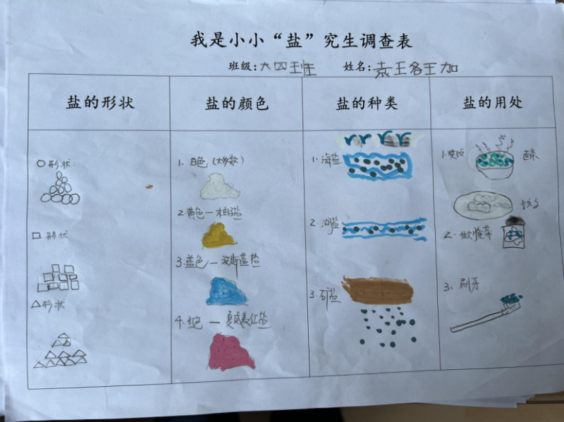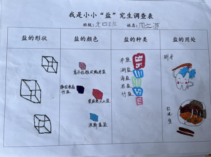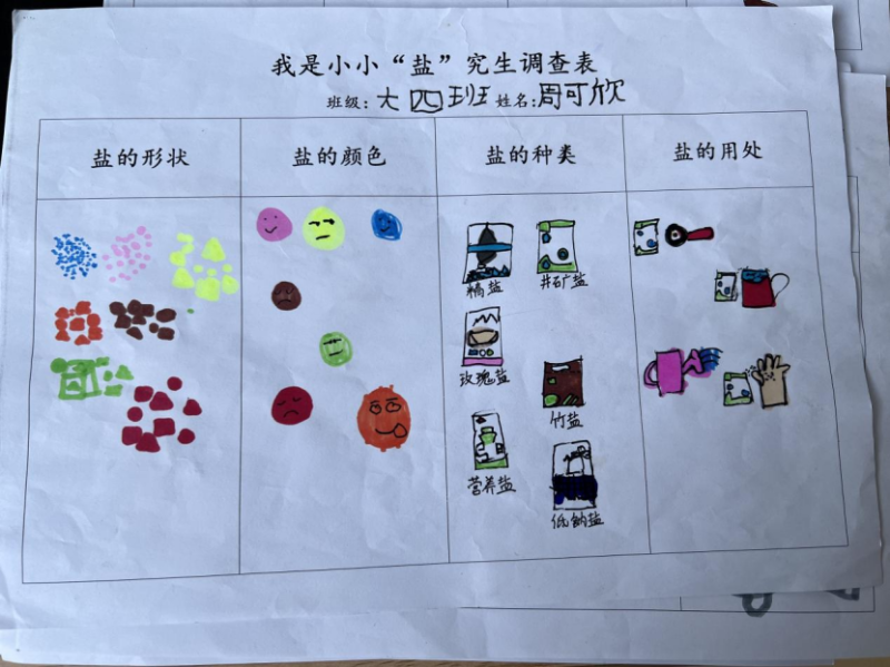 结合幼儿的问题绘制了一张“关于盐的调查表”。通过家园合作,引导他们针对盐的不同作用等进行调查。经过了一番调查,孩子们迫不及待的想要分享一下自己发现。