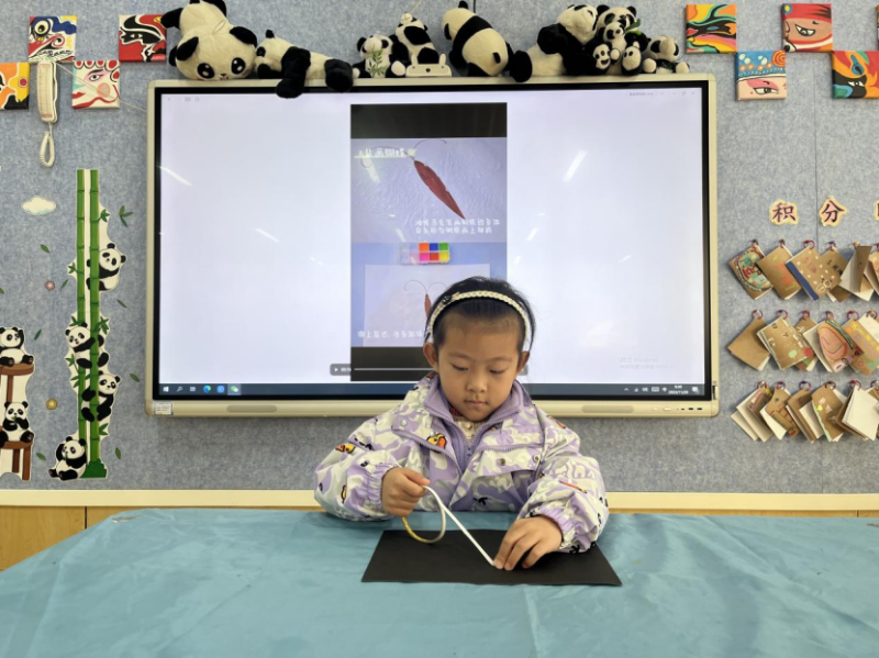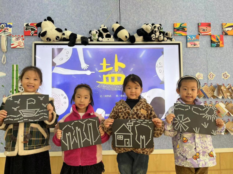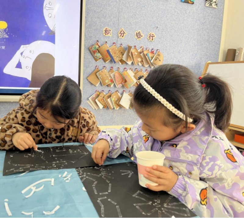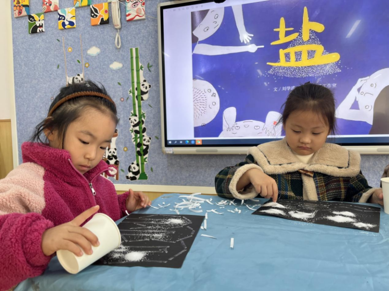 孩子们根据自己的想象在画纸上粘上双面胶,并在画面上撒上盐。就这样一幅幅好看的盐画出现了。