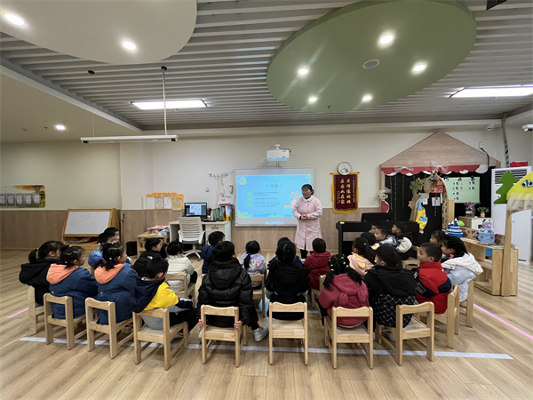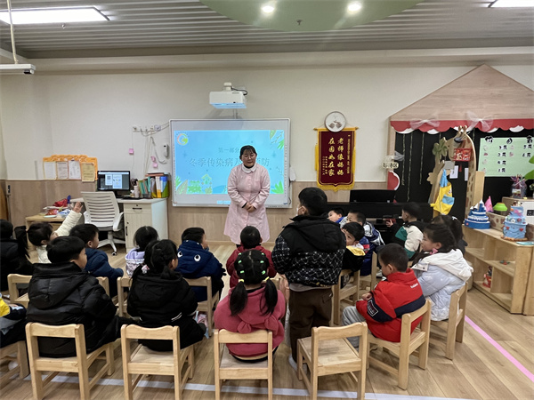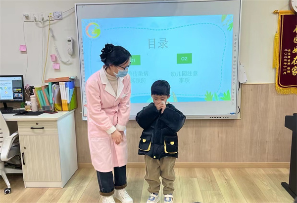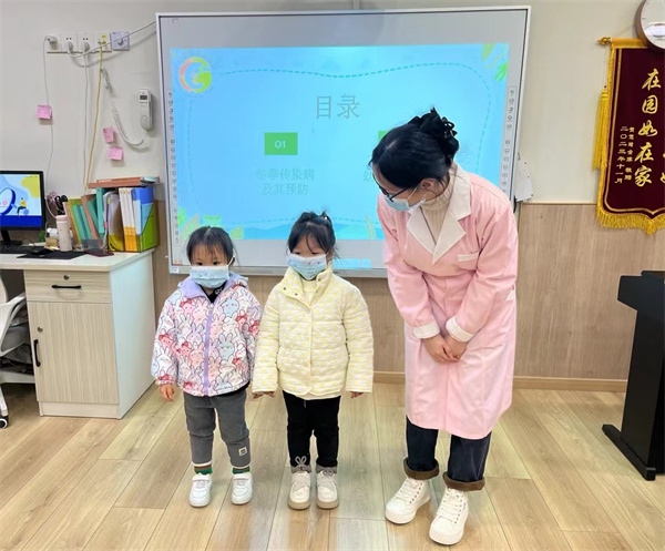 保健医生胡老师首先向小朋友们介绍了冬天传染病主要有流感、疱疹性咽峡咽、手足口病以及诺如病毒感染性肠胃炎等种类。介绍了冬季传染病的传播途径、主要症状以及预防建议。