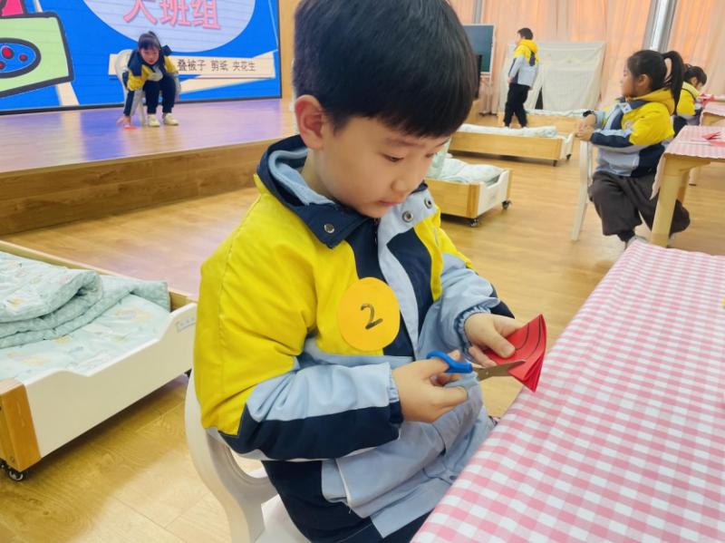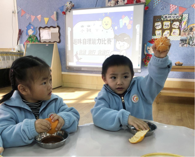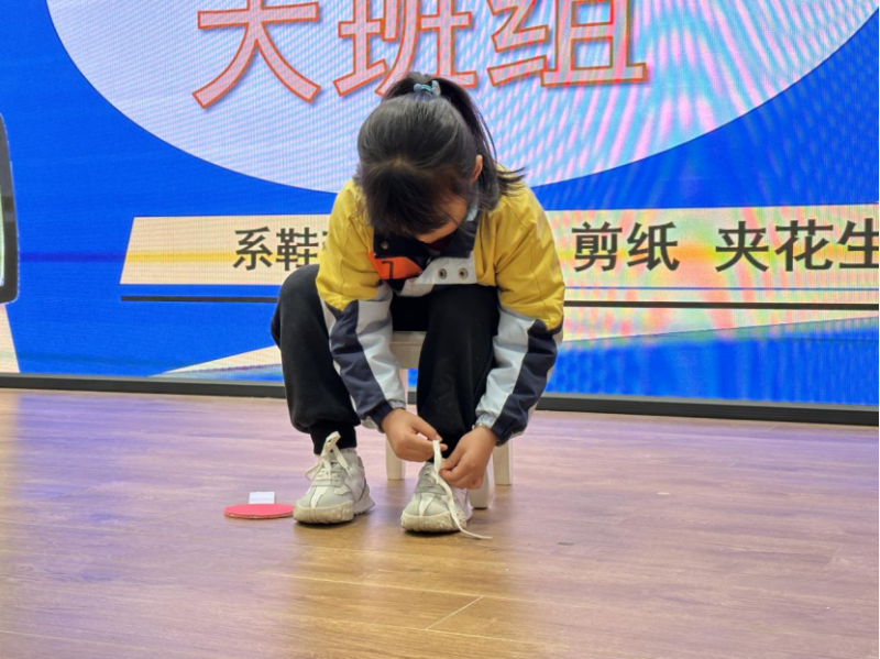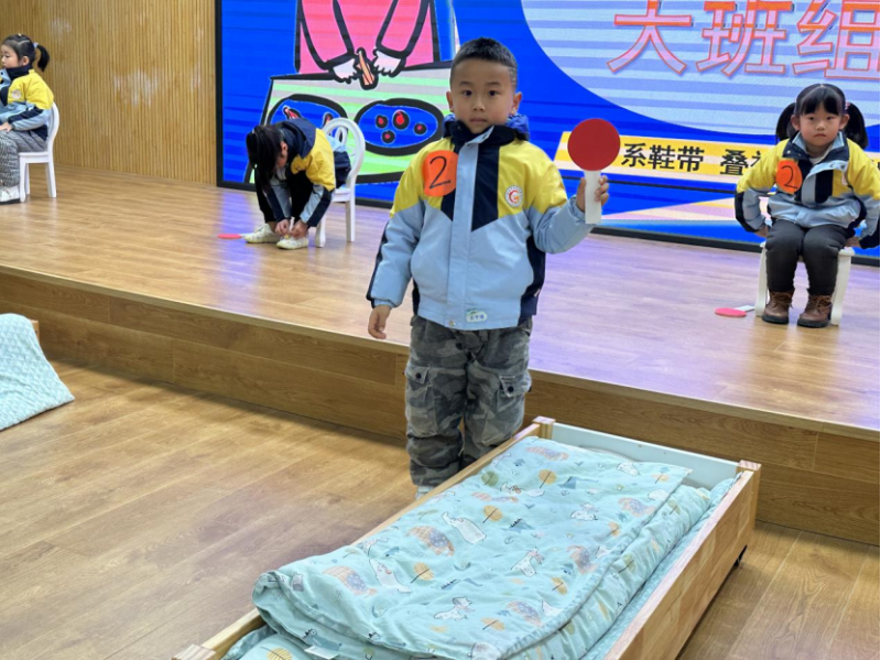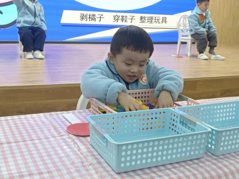 活动开始前,年级教师展开教研会,讨论根据孩子的年龄特点及可行性,制定了初步比赛项目,最终确定小班组比赛项目为:剥橘子、穿鞋子、整理玩具。中班组比赛项目为:穿外套、叠裤子、剥鸡蛋、串珠子。大班组比赛项目为:系鞋带、叠被子、剪纸、夹花生。
